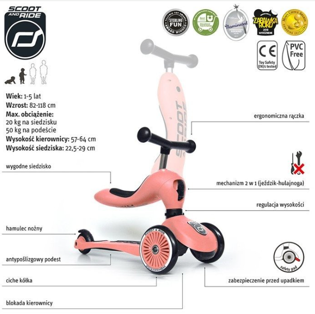 Wyposażona została w opatentowany, rewolucyjny system safety-pad – tj. specjalną szeroką podkładkę, umieszczoną w dole przedniej części, która zapobiega m. in. przewróceniu się na nierównym terenie czy utknięciu kół. Jej pozycję w razie potrzeby również można regulować. Scoot & Ride Highwaykick stanie się towarzyszem zabaw Twojego dziecka na wiele lat.