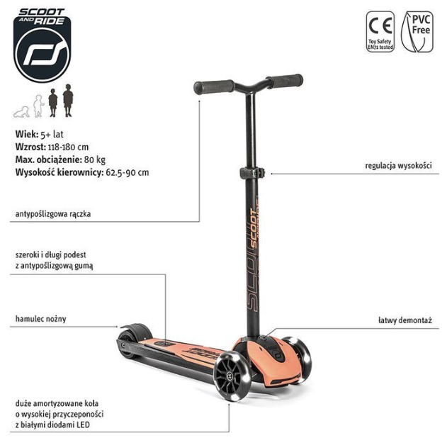 Zestaw SCOOTANDRIDE Kask + Highwaykick 5 LED Hulajnoga trójkołowa balansowa ze świecącymi kółkami 5+ Peach