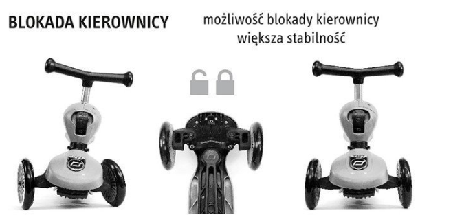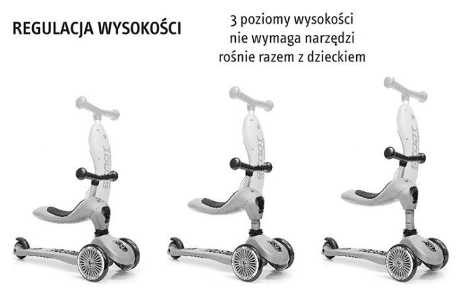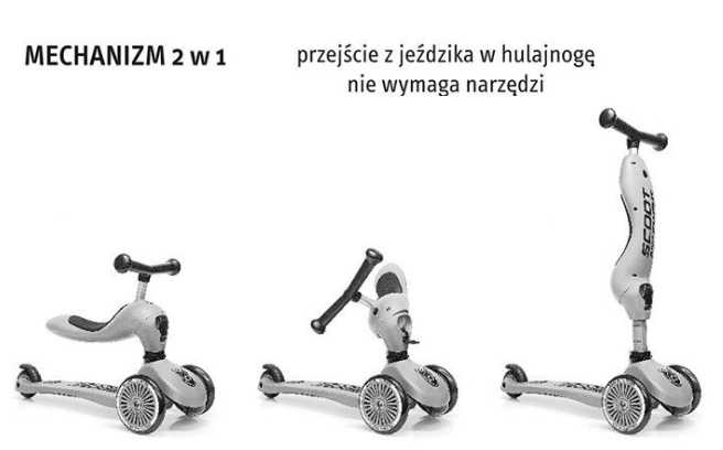 Bez używania narzędzi, za pomocą jednego guzika można w kilka sekund zamienić pojazd w hulajnogę na 3 kołach – obrócone siedzisko staje się jej przednią ramą. Wystarczy jeszcze przenieść kierownicę (montowana na klik) i gotowe! Teraz także starszak może rozpocząć swoją scaterską przygodę.