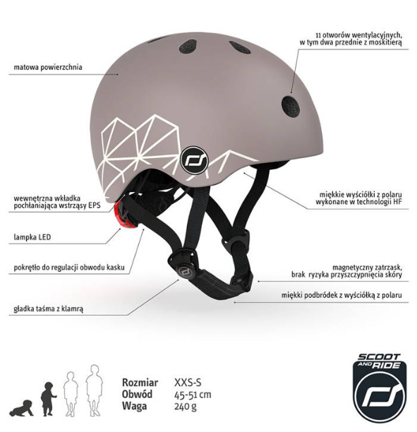 - Kask ScootAndRide 1-5 lat XXS - S (na obwód głowy od 45 do 51 cm) w kolorze hulajnogi.