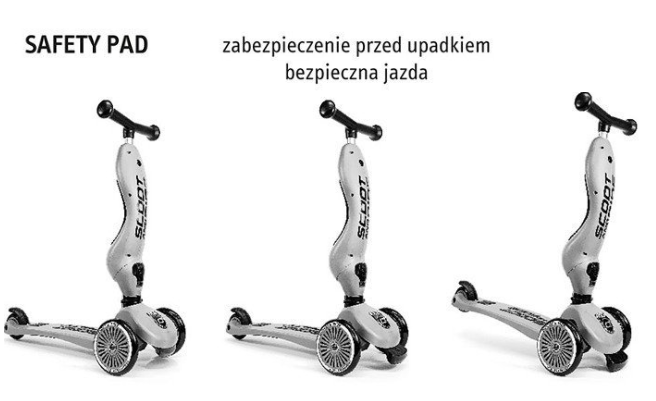 Wyposażona została w opatentowany, rewolucyjny system safety-pad – tj. specjalną szeroką podkładkę, umieszczoną w dole przedniej części, która zapobiega m. in. przewróceniu się na nierównym terenie czy utknięciu kół. Jej pozycję w razie potrzeby również można regulować. Scoot & Ride Highwaykick stanie się towarzyszem zabaw Twojego dziecka na wiele lat.