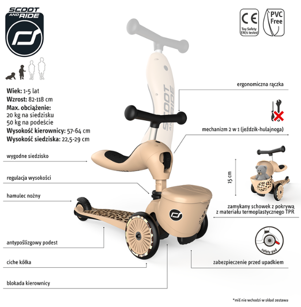 Zestaw SCOOTANDRIDE Kask + Highwaykick1 2w1 jeździk i hulajnoga z zamykanym schowkiem Leopard