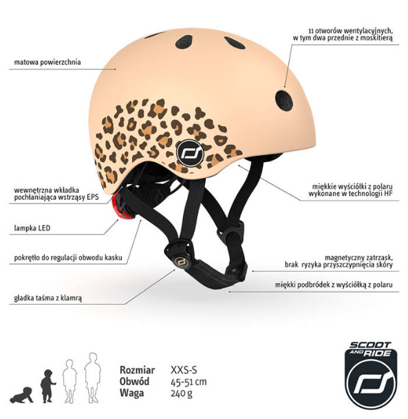 - Kask ScootAndRide 1-5 lat XXS - S (na obwód głowy od 45 do 51 cm) w kolorze hulajnogi.