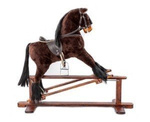 Duży koń na biegunach kary z białym siodłem